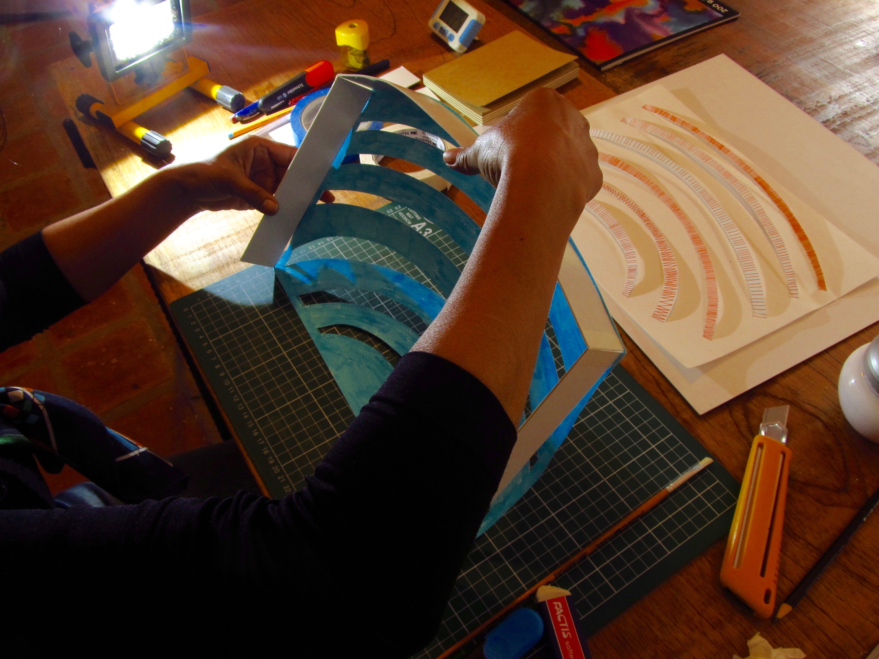 Una vez instalada en la residencia KAI, la artista se trasladó a las localidades de Moray y Pisac donde desarrolló un trabajo in situ y recorrió las terrazas de regadío que allí se encuentran. Estas construcciones escalonadas son de interés de Bórquez porque presentan una amplia presencia de diseños geométricos, tema esencial de su trabajo artístico, y por la arquitectura de grandes dimensiones que envuelven al visitante, generando una experiencia de inmersión. El interés de la artista fue materializar esta experiencia en series gráficas que se expandieran hacia la tridimensionalidad y aumentaran su potencial a través del sonido y la iluminación.