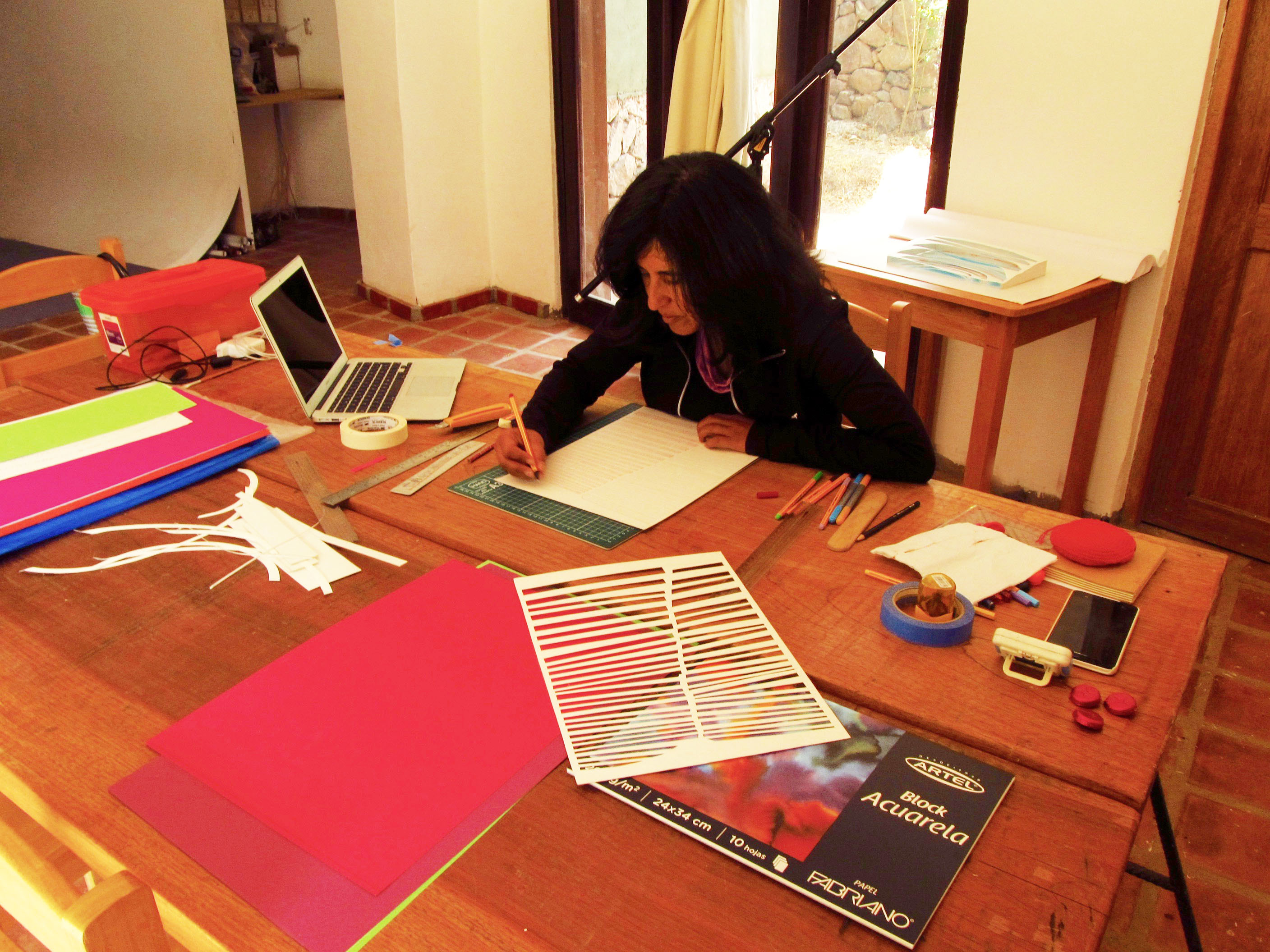 Ximena Bórquez, es una artista visual Chilena que se ha especializado en lenguajes gráficos, abarcando desde técnicas tradicionales de impresión hasta medios alternativos de traspaso. Se enmarca dentro de la “Media art”, investigando en procesos digitales para imagen y sonido, y la “Gráfica Expandida”, en un deseo de complementar estas nuevas tecnologías con objetos materiales tangibles. Atraída por los ordenamientos repetitivos utiliza tramas geométricas que generan vibración óptica. Esta vibración le interesa como vía para plasmar universos visuales que operan fuera de nuestra percepción ordinaria, intentando expresar visualmente la energía. Con un sello de identidad, sus últimos trabajos abordan la imaginería y arquitectura de culturas precolombinas. Esta vez, para una de las etapas de producción de su más reciente proyecto «Takanas, Geometría del Agua«, la artista eligió a la residencia KAI como centro de trabajo.